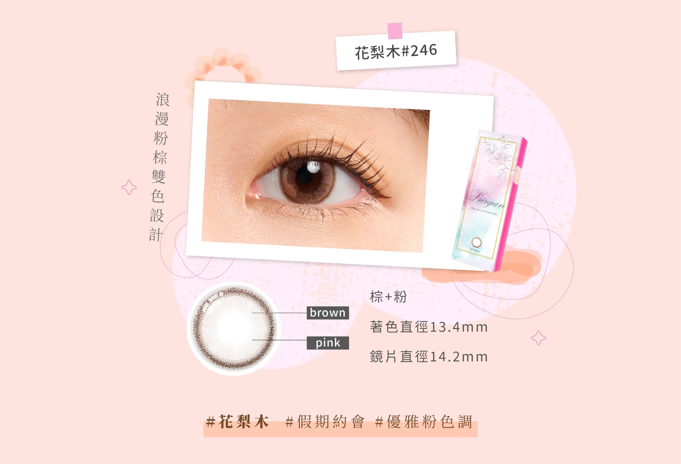 木質調的淺棕色外面搭配淺淺的粉色,讓眼睛不那麼銳利,透出一絲溫柔眼神。仍保留外圈的設計一樣能放大的眼神的效果,讓粉色不那麼突兀、不自然!