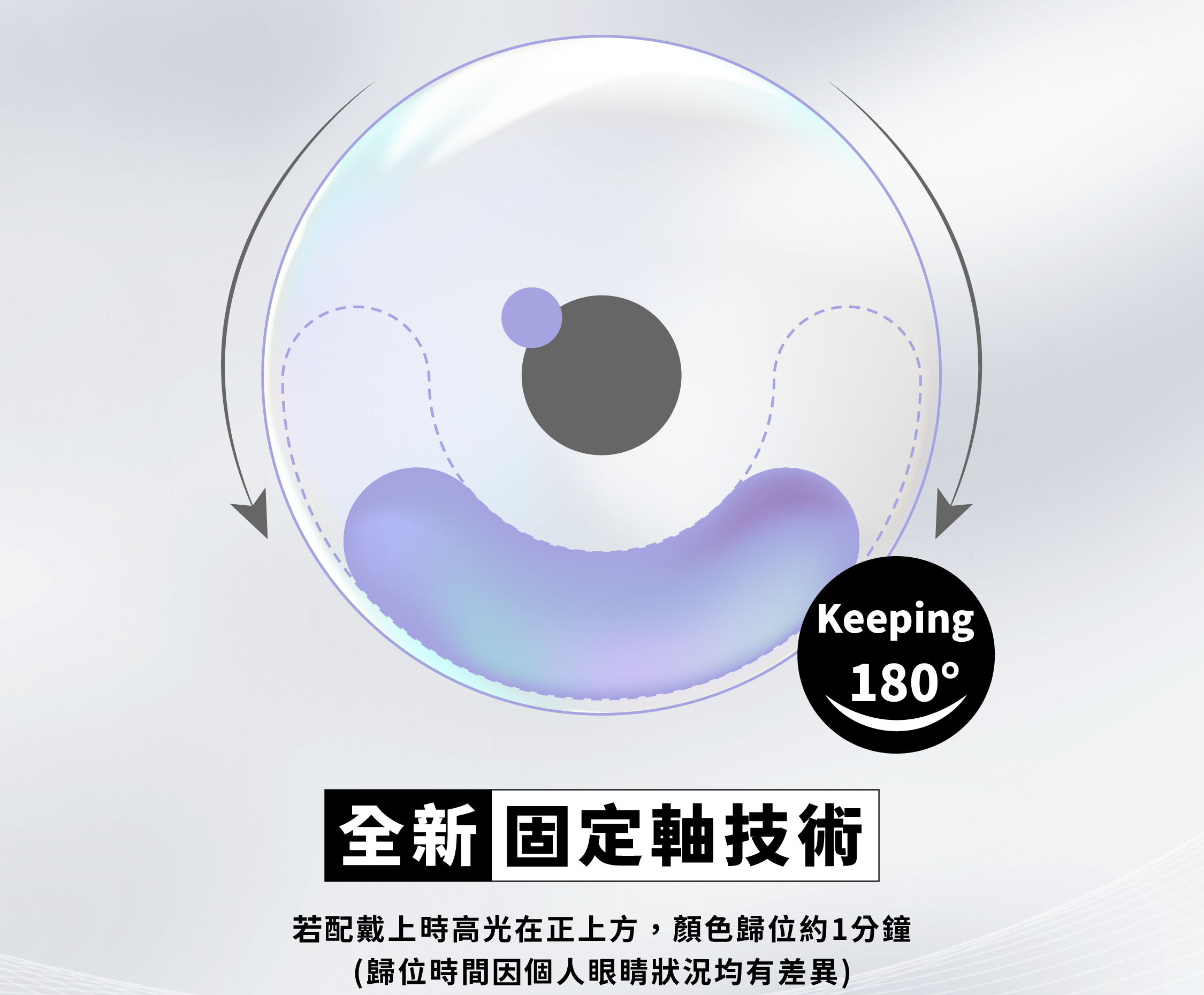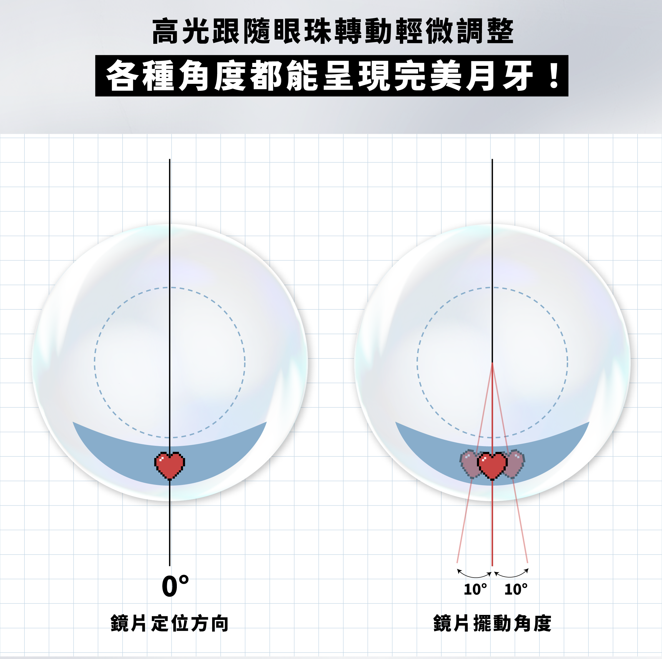 💡 全新固定軸技術:鏡片採用特殊技術,將月牙、高光固定在鏡片的正確位置上,即使眼睛眨眼或轉動也不易跑位。