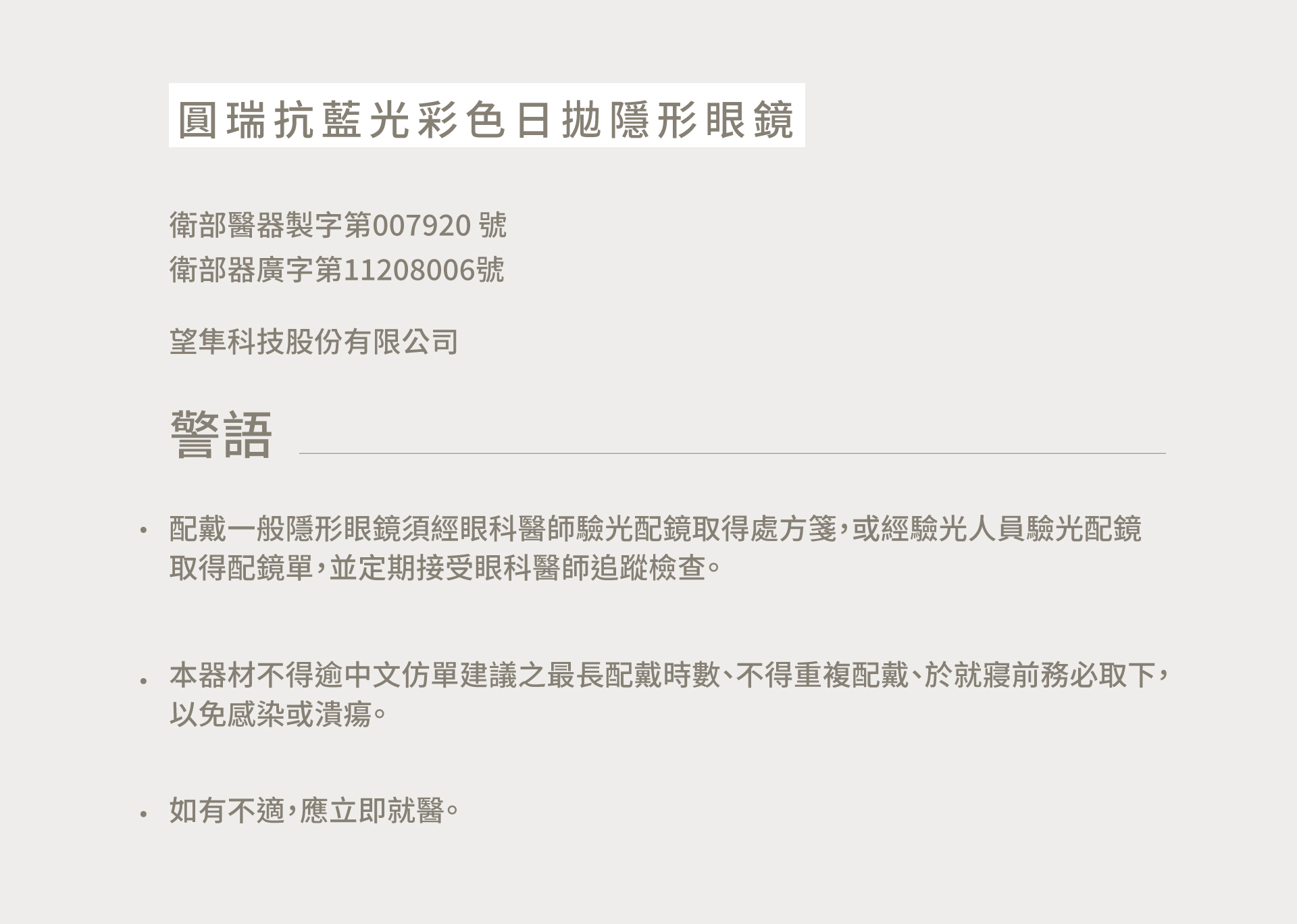 ・配戴一般隱形眼鏡須經眼科醫師或合格驗光人員驗光配鏡,定期接受眼科醫師追蹤檢查・本器材不得逾中文仿單建議之最長配戴時數、不得重覆配戴,於就寢前務必取下,以免感染或潰瘍・如有不適,應立即就醫。衛部醫器製字第004648號、衛部醫器製字第004649號、衛部醫器製字第004650號