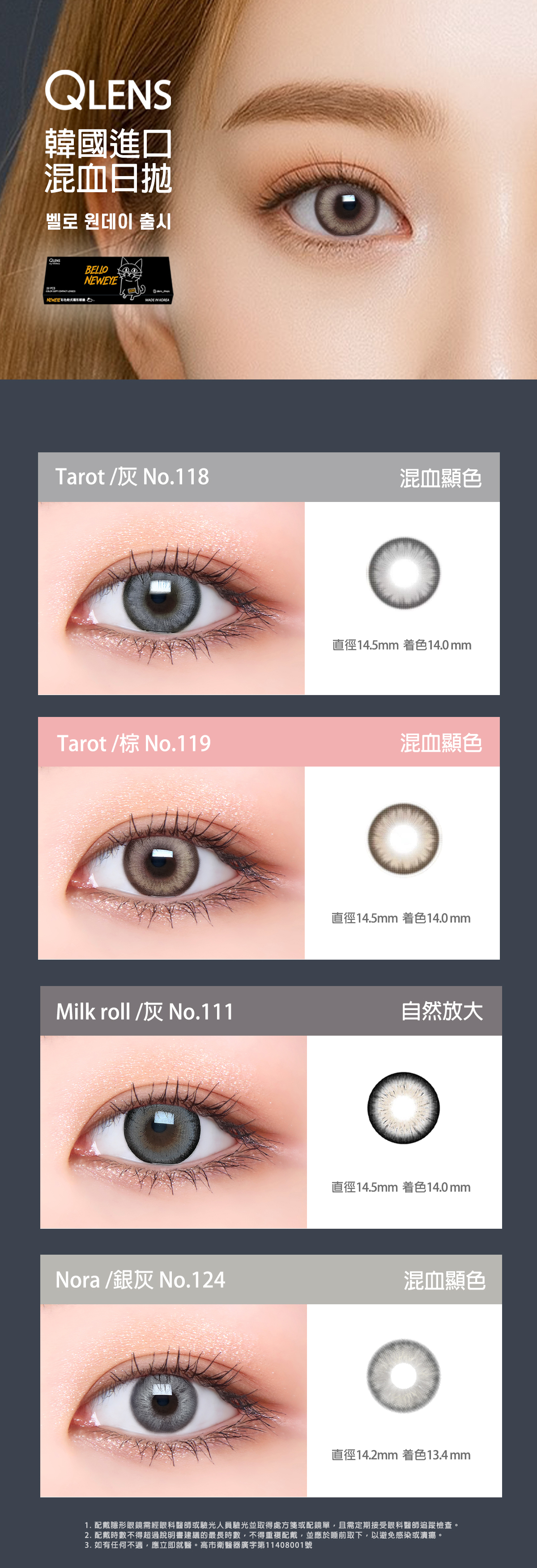 ・配戴一般隱形眼鏡須經眼科醫師或合格驗光人員驗光配鏡,定期接受眼科醫師追蹤檢查・本器材不得逾中文仿單建議之最長配戴時數、不得重覆配戴,於就寢前務必取下,以免感染或潰瘍・如有不適,應立即就醫。衛部醫器製字第004648號、衛部醫器製字第004649號、衛部醫器製字第004650號