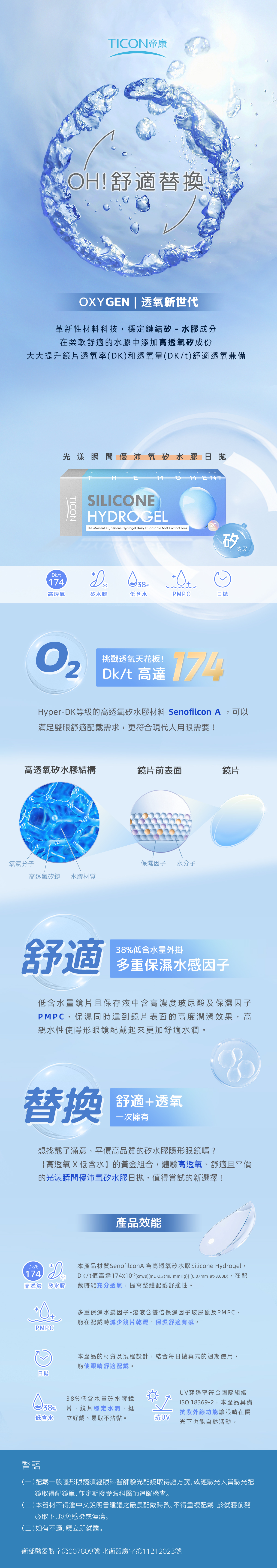 ・配戴一般隱形眼鏡須經眼科醫師或合格驗光人員驗光配鏡,定期接受眼科醫師追蹤檢查・本器材不得逾中文仿單建議之最長配戴時數、不得重覆配戴,於就寢前務必取下,以免感染或潰瘍・如有不適,應立即就醫。衛部醫器製字第004648號、衛部醫器製字第004649號、衛部醫器製字第004650號