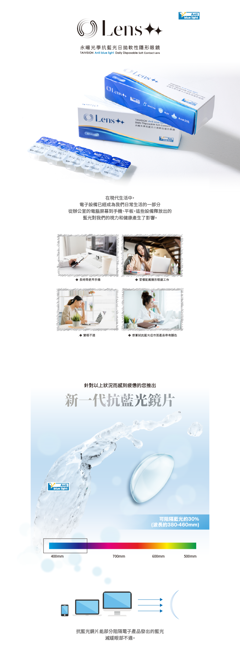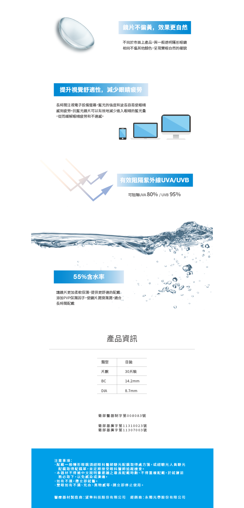 ・配戴一般隱形眼鏡須經眼科醫師或合格驗光人員驗光配鏡,定期接受眼科醫師追蹤檢查・本器材不得逾中文仿單建議之最長配戴時數、不得重覆配戴,於就寢前務必取下,以免感染或潰瘍・如有不適,應立即就醫。衛部醫器製字第004648號、衛部醫器製字第004649號、衛部醫器製字第004650號