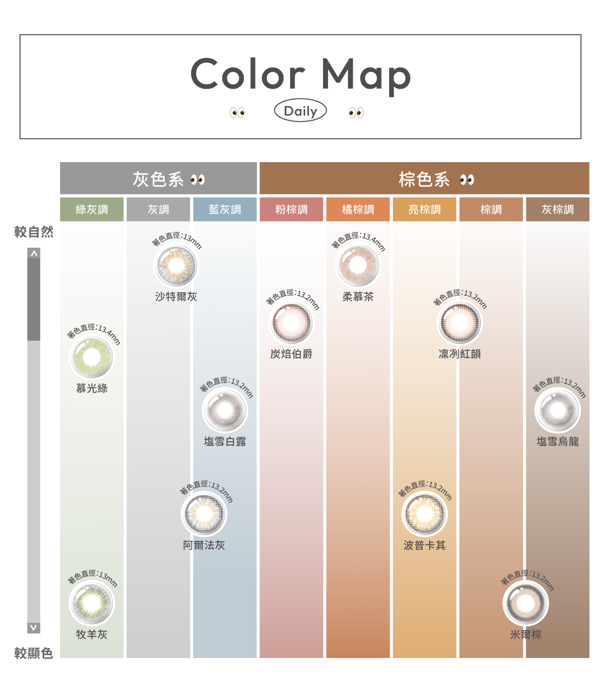 婉約而輕盈的淡黃綠,將盎然春意完美融入雙瞳,不挑人的無邊框花紋,打造溫柔靈動眼珠