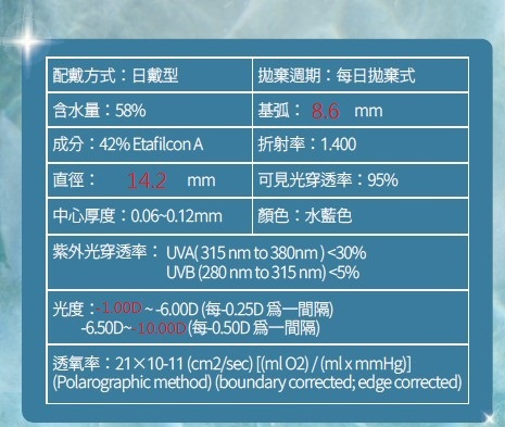 ・配戴一般隱形眼鏡須經眼科醫師或合格驗光人員驗光配鏡,定期接受眼科醫師追蹤檢查・本器材不得逾中文仿單建議之最長配戴時數、不得重覆配戴,於就寢前務必取下,以免感染或潰瘍・如有不適,應立即就醫。衛部醫器製字第004648號、衛部醫器製字第004649號、衛部醫器製字第004650號